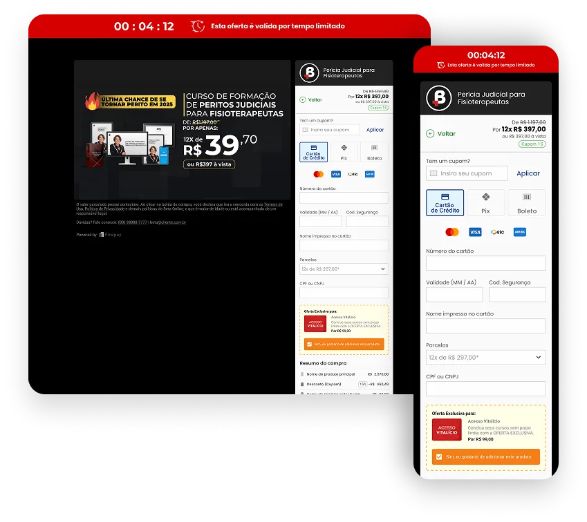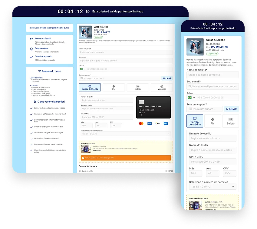 Na Firepay você pode decidir qual modelo de checkout se adequa aos eu negócio, e personalizar todas jornada de compra, do início ao fim.